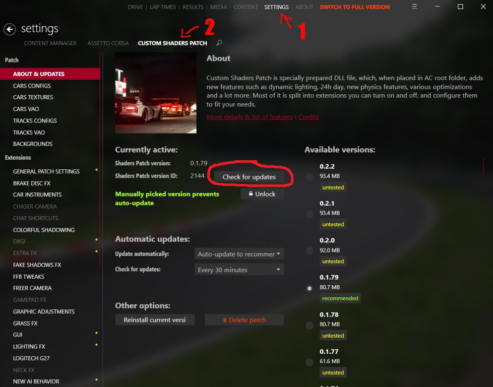 Na janela do Content Manager, no menu superior, selecione a opção “SETTINGS” (1), em seguida no menu “settings” selecione “CUSTOM SHADERS PATCH” (2)