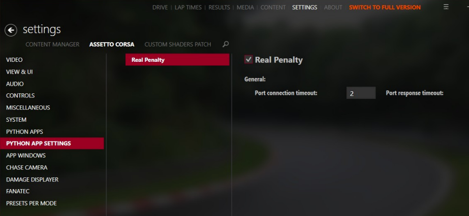 Quando você instala um APP, como o “Real Penalty”, é necessário ativá-lo para que a instalação tenha efeito. No caso do “Real Penalty”, acesse o menu “SETTINGS”, “ASSETTO CORSA”, “PHYTON APP SETTINGS”. Na janela da direita, selecione “Real Penalty” e marque a caixa “Real Penalty”, na direita, conforme figura abaixo.