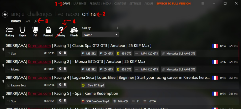 Abra o CM, no menu superior, selecione o menu “DRIVE”, selecione a opção “online”. Será aberta uma lista de servidores online. Logo abaixo do segundo menu, existem 3 opções, “KUNOS”, “LAN” e uma lupa. Antes de clicar na lupa, desmarque (tirar a faixa vermelha) a opção “Missing”. Clique na lupa e escreva “guerreiros” e tecle ENTER.