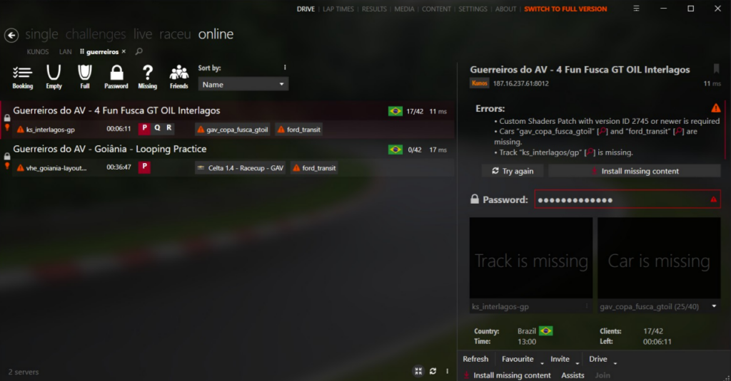 Clique no servidor referente ao evento/campeonato que você está inscrito e insira a “SENHA DO SERVIDOR” que você encontra na descrição do grupo do whatsapp e dê ENTER.